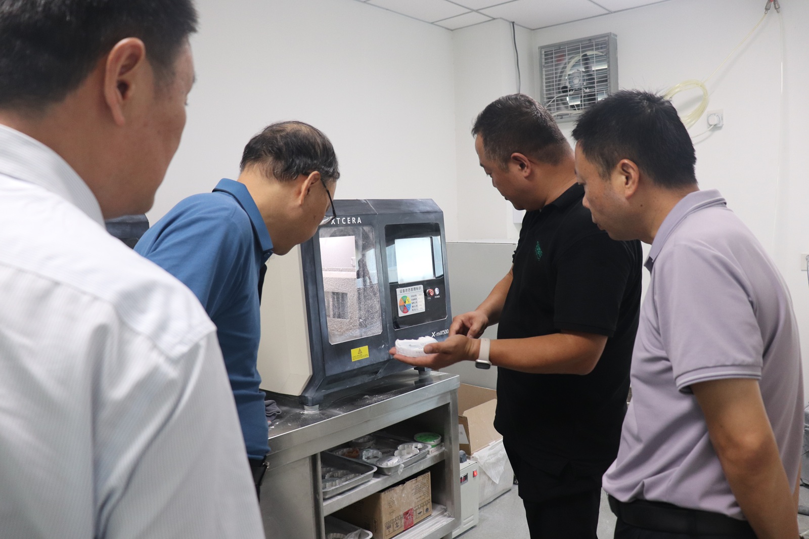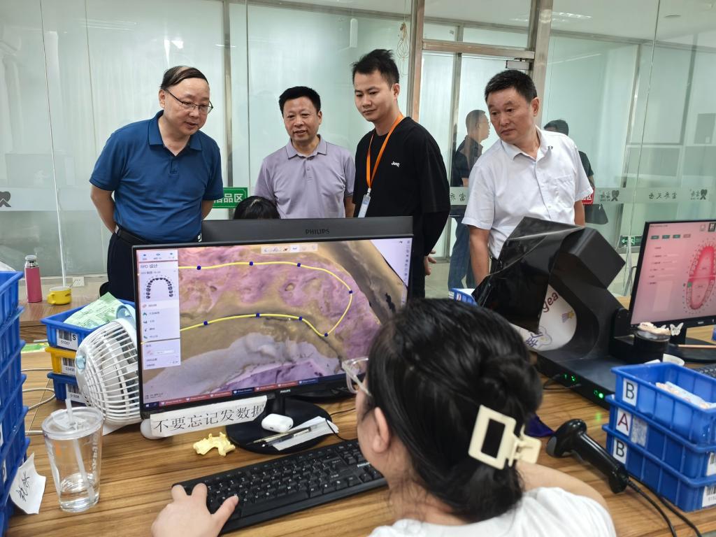 在武汉宏捷医疗器械有限公司,调研团队参观了口腔数字化诊疗设备研发中心和智能义齿生产线。企业负责人详细介绍了AI辅助诊断系统、3D打印义齿技术等创新成果,并现场演示了数字化扫描仪在口腔修复中的精准应用。胡昌杰副校长表示:“随着口腔医疗行业朝着智能化、个性化方向加速转型,学院必须及时调整课程体系,增强学生在数字化技术、新材料应用等领域的实践能力。”