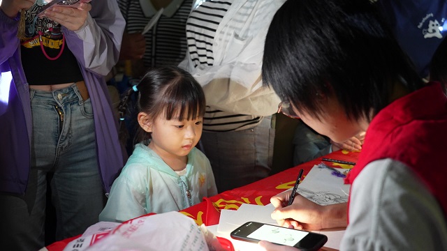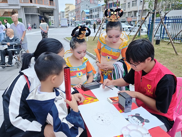 志愿服务过程中,成员们特别关注到社区孩子们的审美需求。他们发挥创意与特长,为小朋友们量身创作了众多受欢迎的卡通形象和专属画作:从活泼可爱的“小猪佩奇”到勇敢无畏的“哪吒”,一个个生动的形象在志愿者的妙笔下跃然纸上,赢得了孩子们的阵阵欢呼和灿烂笑容,极大地满足了他们对“美”的向往和期待,现场气氛温馨而热烈。